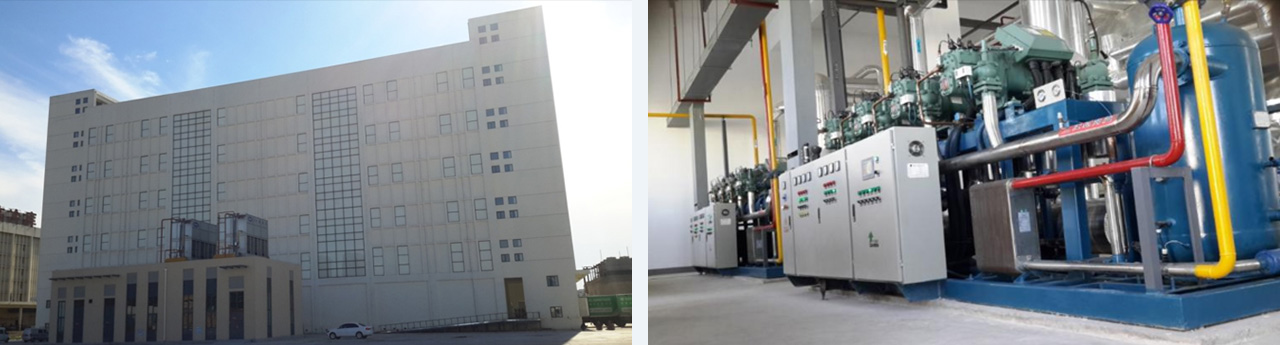 一座六層土建冷庫,總建筑面積25898㎡,總存儲(chǔ)噸位三萬噸,層高5.8米,共10間冷庫,采用氟利昂(R22)制冷系統(tǒng),末端鋁排管,手動(dòng)熱氣融霜。