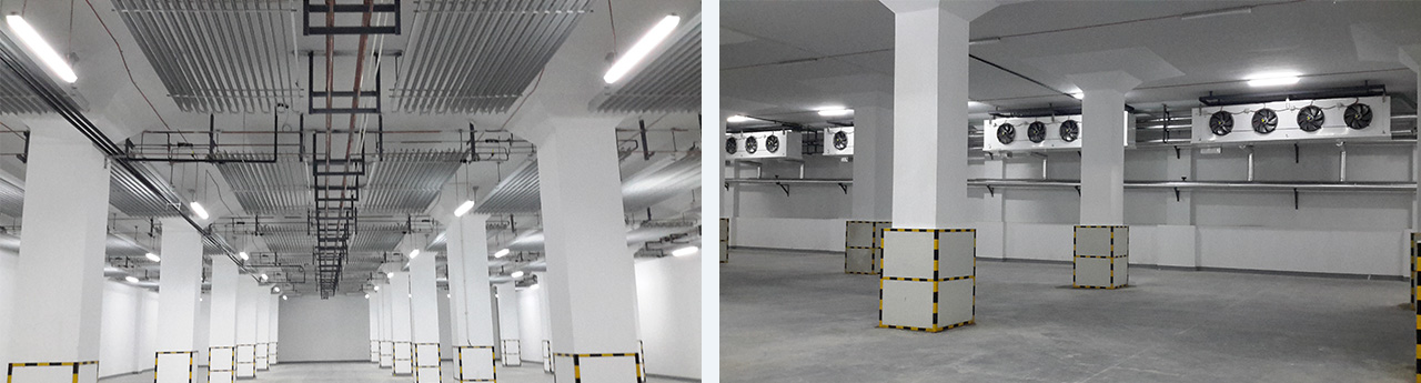 兩座六層土建冷庫,冷庫面積90000㎡,庫容超10萬噸。含低溫庫、高溫庫。采用氟利昂(R507)制冷系統,末端冷風機及排管,鋁排管采用定期手動掃霜,冷風機采用水沖霜,自動或手指令控制。業主單位南通農副產品物流有限公司是由南通汽運實業集團有限公司、南通市供銷合作總社和中國農發重點建設基金有限公司共同出資建設的一家綜合性農產品批發市場。